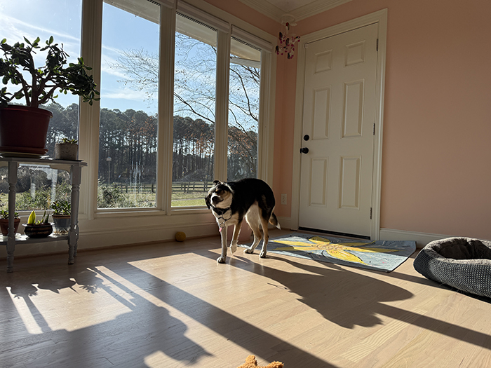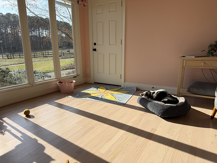 She has beds around the house but this morning I found her here in my office, snoozing away in the sun (normally her bed is against the windows but she likes to drag it all around at night):
