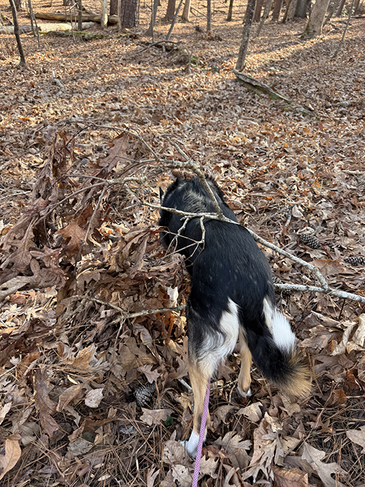 Sometimes she gets following a trail and just walks right through fallen branches: