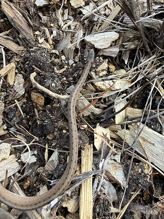 Found a DeKay's Brown Snake while I was gardening. I was sweeping up some leaves on the front porch when I uncovered it and it was curled up and upside down. Oh dear...but then I noticed that it seemed pretty plump, and a little shiny. I picked it up with a rake and carried it to a safe place and it promptly flipped over and unwound :-) I looked it up and yep, they do indeed try to fool predators by playing dead!
