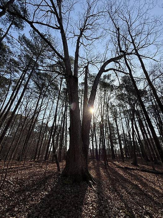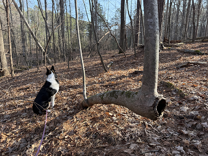 I tell Lucy to wait when I want to take a photo, so she sits and watches for deer. What a weird tree this is!