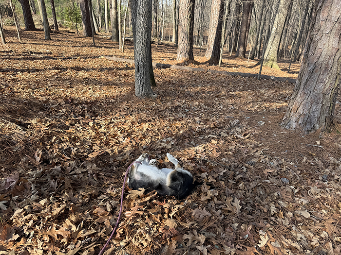 As we get closer to the house and I start talking about being done and what a nice walk we've had, Lucy has to flop onto the ground and roll all around a few times, you know, just to coat herself in all the good smells of the forest:
