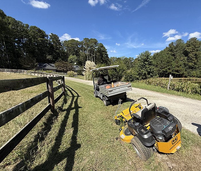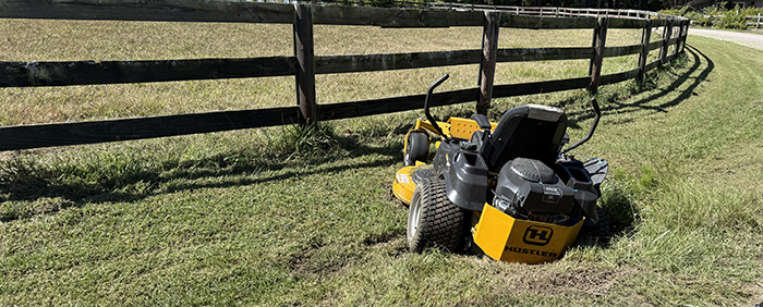 B-Rad pulled it out with the golf cart and a chain, showing us how while he did it. But, not to be outdone by my ability to straddle mow, he had to try it: