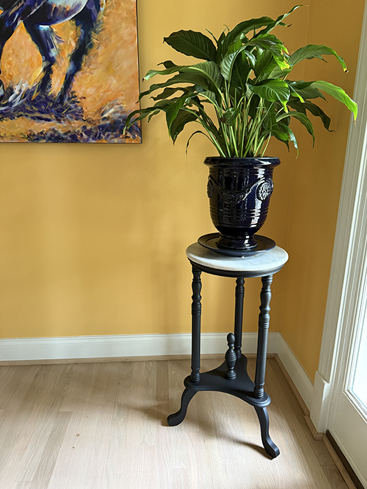 When my brother was here last, we found these old marble topped plant stands that we liked. The finish was just gross and powdery so I slapped a coat of flat black paint on them while watching TV one night: