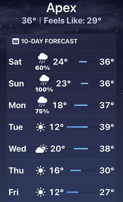 And I'd like to keep it that way! We have a generator so we will have minimal lights, fridge, internet, but not enough to heat the house. And while these temps aren't the end of the world for a lot of you, this is preeeety cold for NC, and will not be fun with no heat in the house: