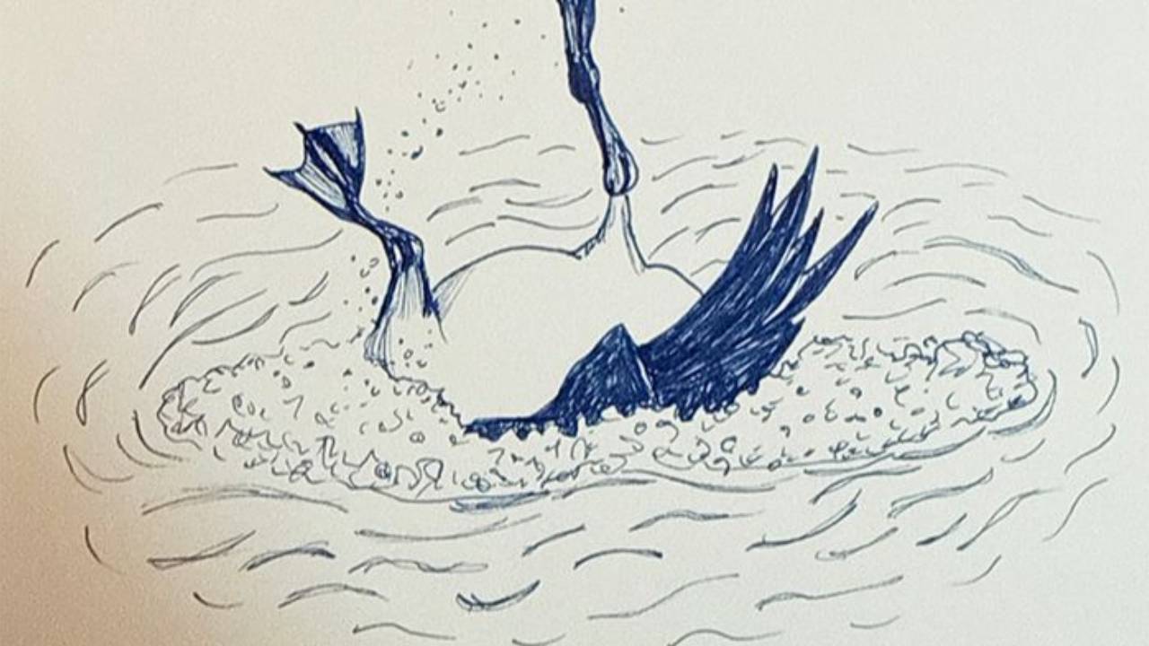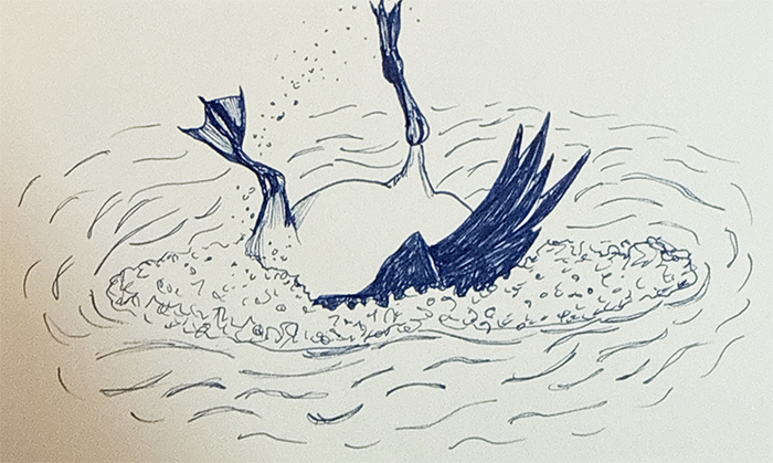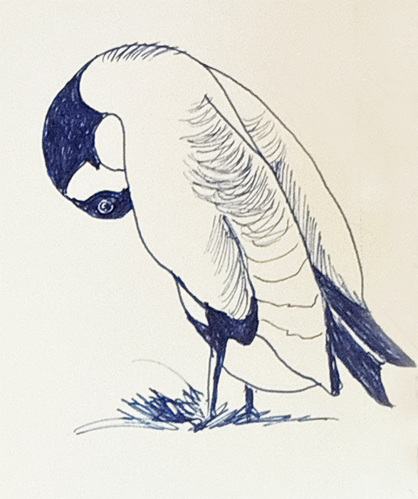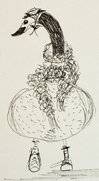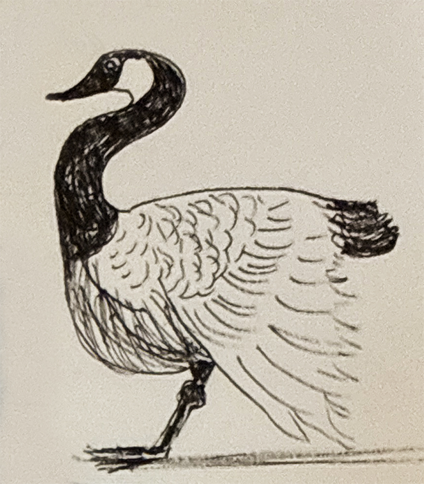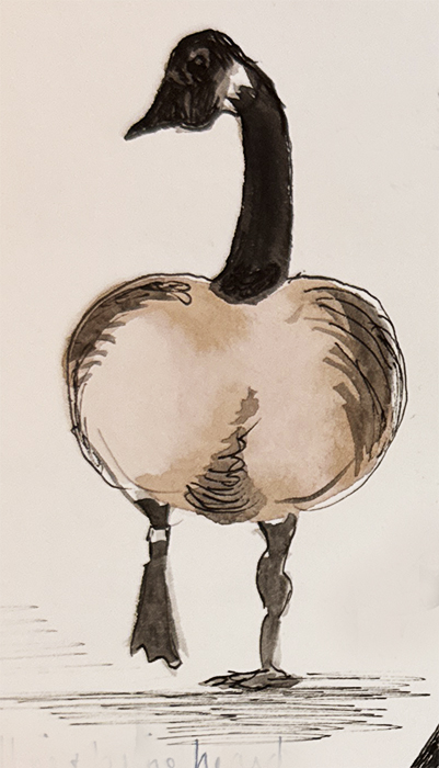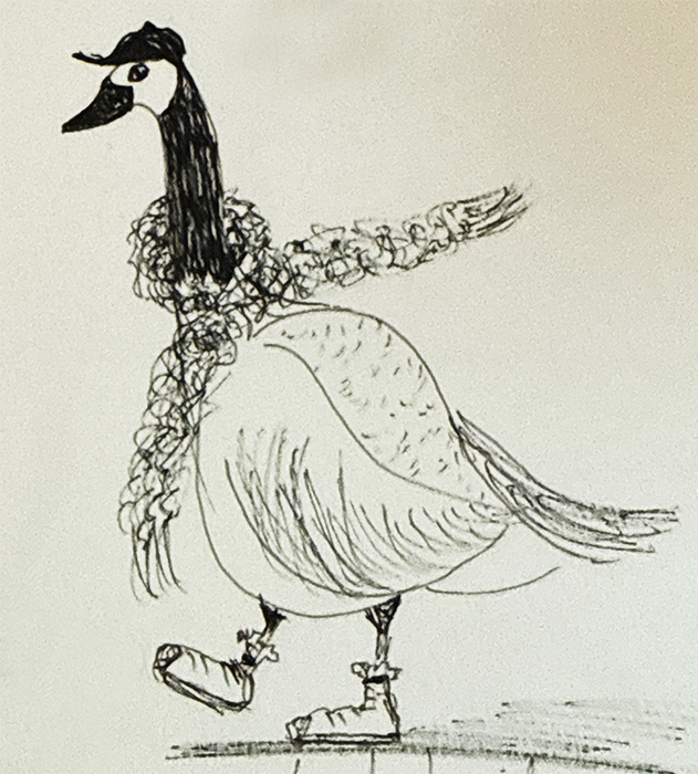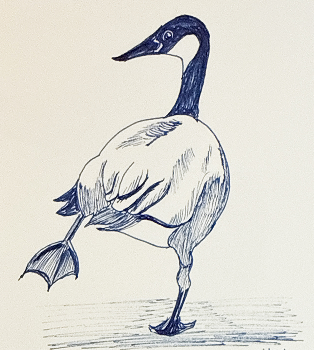 I had to draw this one! Brad said he saw our lone goose flip itself over backwards, wiggle all around with it's feeties in the air, do a complete backwards somersault and pop back up! I wish I could have seen that!
