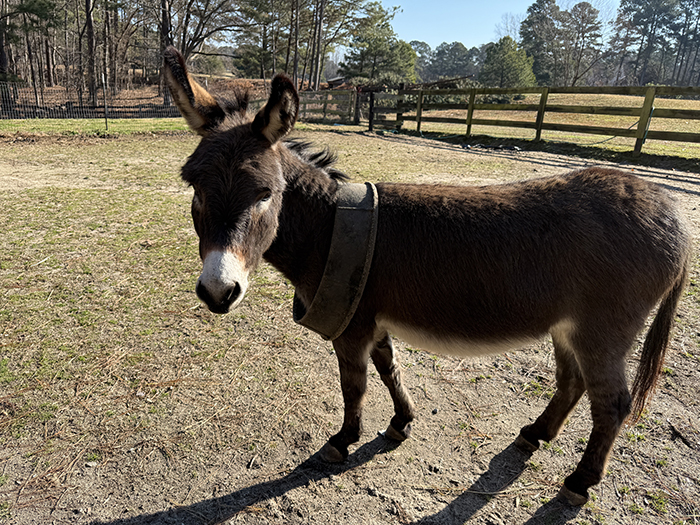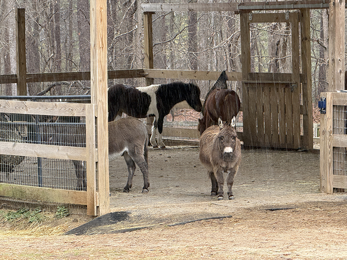 Speaking of donkeys, I found Jaffe with the feed pan loop around his neck again, which means he and Sweetness were rough housing 😂: