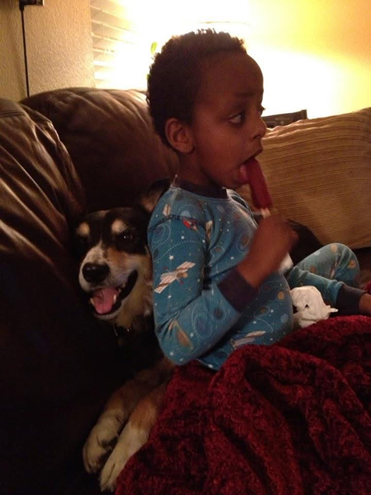 A sweet memory popped up, this little photo of a sick 6 year old ManChild with his friend Midgie. The fb caption read: The evening's Midge and ManChild pic. He was hyperventilating because he feels like crap—Midge jumped up behind him and he slowly calmed down. Of course a popsicle always helps :-)