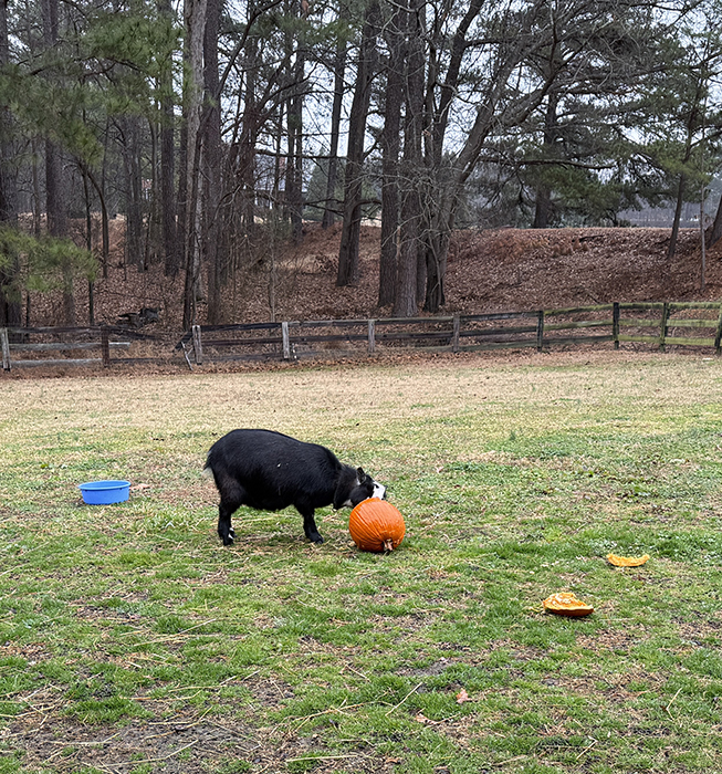 A bit of a drizzle this week didn't deter Mama Dancer from her pumpkin treat! Crazy because goats will run for shelter at the first sign of rain, they absolutely hate it. I've never seen this before: