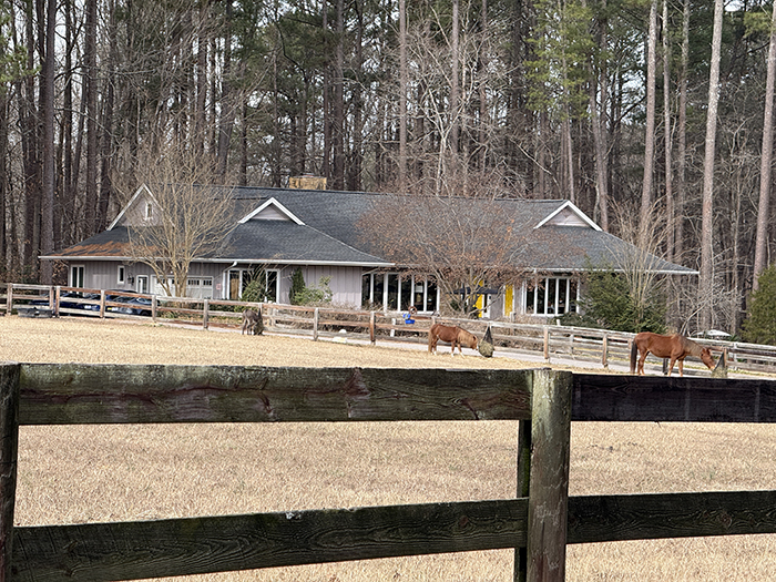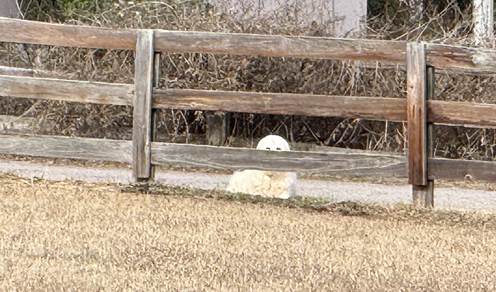 Brad and I took the golf cart up to the road to get the mail, when we came back, we stopped at the entrance to our driveway to talk about a new Mother Ranch sign as my current ones are starting to deteriorate. I looked down the drive at the horses and saw The Polar Bear, waaaay off, can you see her? I could barely see the two dark dots of her eyes, she was lying down but stretching up, watching us over top the lower fence rail: