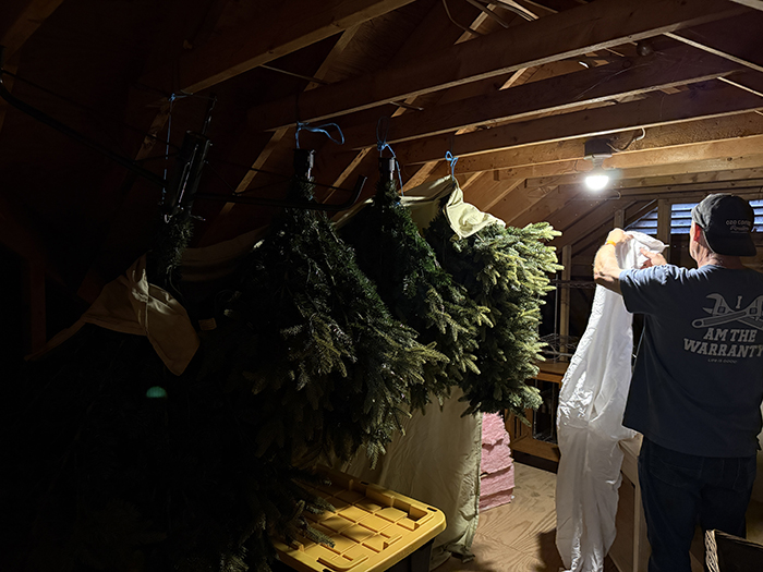 Christmas stuff came down this week, just in time for the Women's Circle to restart. I'm always so happy to get it up and so happy to take it down again. Because of the house fire last year, we have a new tree, 9' tall. We usually take all the ornaments off and then wrap it in a sheet and store it in the attic. But with that super tall tree, it didn't quite fit the way Brad was expecting. I found him upstairs with the tree hanging in sections as if it were flowers drying from the rafters lol, it works: