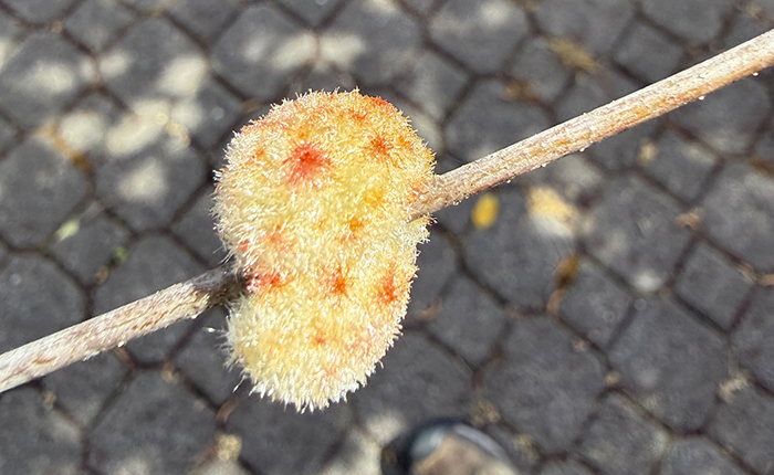 The fuzzy, felt-like texture with those little reddish dots is unmistakable — each red spot is actually a seed-like structure inside the fuzz containing an individual larva.
