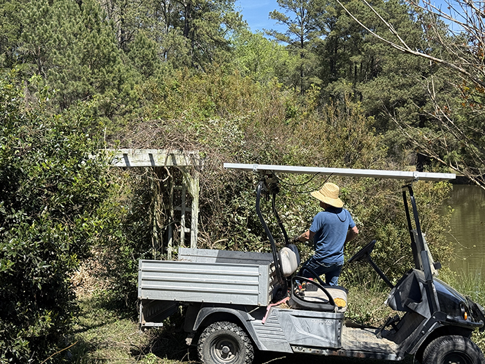 I've been planting daylilies, ajuga, and lambs ears, and Brad's been cutting back pampas grass and taking down all the invasives. This arbor was covered with trumpet vine, honeysuckle, and sweet autumn clematis:
