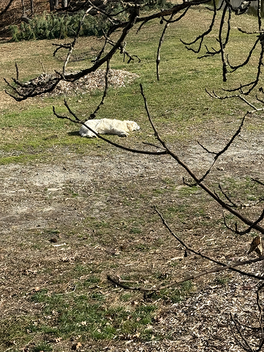 After the Jan 2nd fire this year, when we had all the workers here at the farm, we would occasionally find The Polar Bear wandering around with a tied plastic grocery bag carefully dangling from her mouth. Bow still tied, completely intact. A worker's lunch was wandering away to be eaten on the sly. OMG! Then we started finding her trying to pull the grocery bag with rotisserie chicken in it, out of our car! If she finds anything in the garage trash can that smells like food, she's definitely going to root around, steal it, lick it clean, and then destroy the container. Ugh.