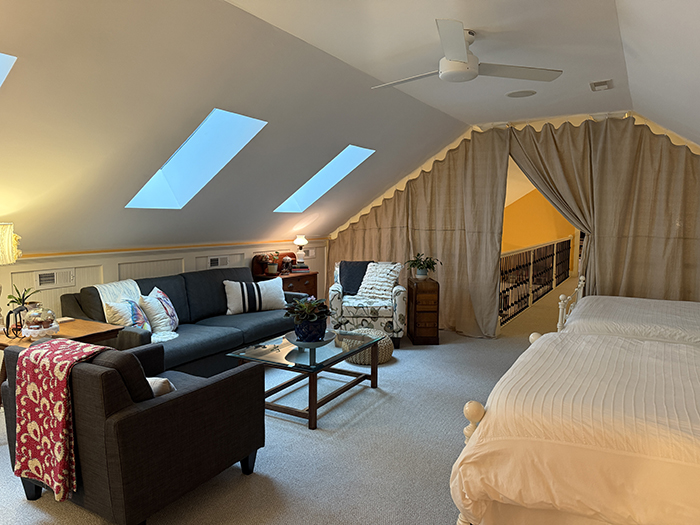When Michael, Nic, and puppy Penelope came to visit, I had to get my bedroom finished and the guest room finished as well. The guest room is the loft (my old bedroom) and it overlooks the living room. We weren't willing to completely wall it off but wanted more privacy and the ability to heat and cool just that room (there is a separate heat pump ) since my bonus room bedroom now has a mini-split unit for heat and a/c. So, this is what we came up with and love it: