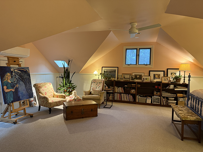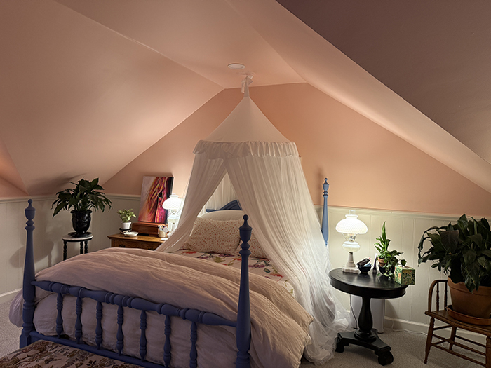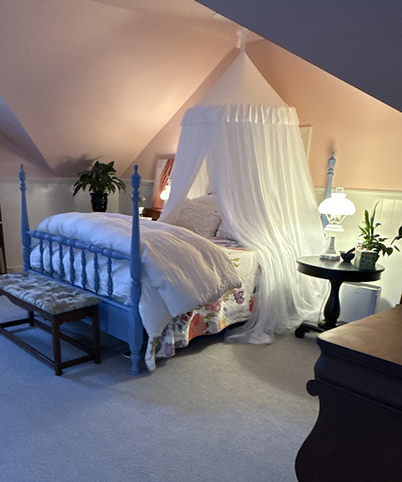 I'm standing in the door and to the right of another painting area with my easels and acrylics. And then this is my princess bed: