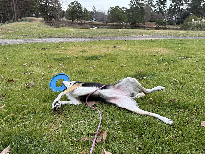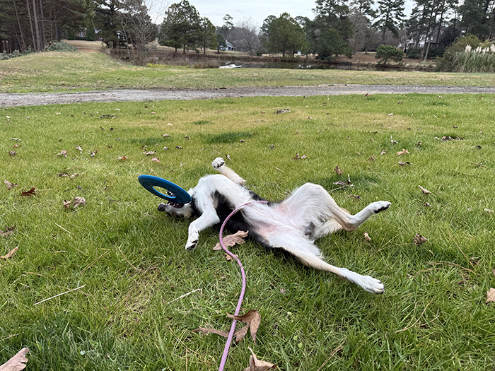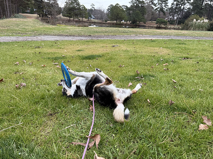 My funny girlie! We had been out in the field playing frisbee until she was tired but when I told her we were done and it was time to go back inside, this is what she did: