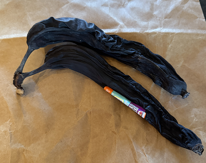 I found these bananas in the pantry, they were good when we left January 2nd. Who knew this is what they did as they get old. They look like huge vanilla beans: