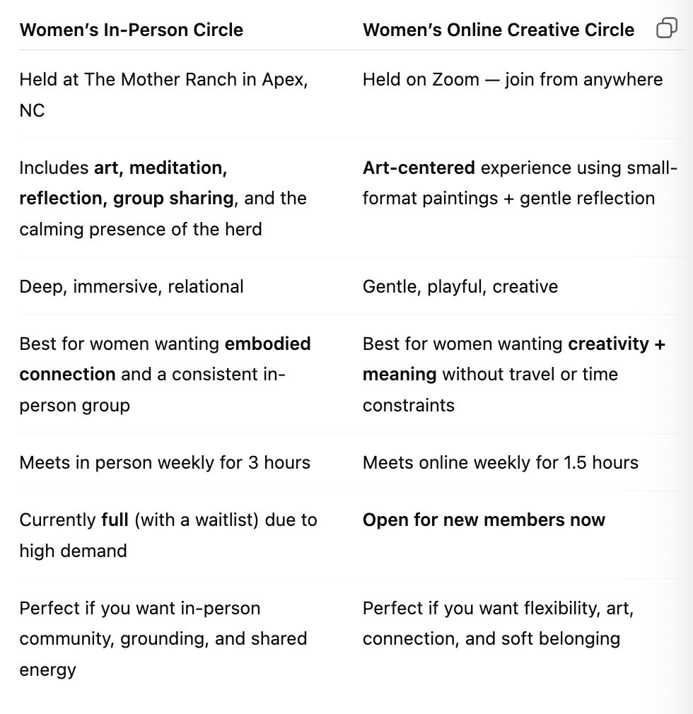 A deeper, more immersive experience held at The Mother Ranch, combining art, meditation, reflection, and the calming presence of the herd. This circle is currently full with a waitlist. If you'd like to be added to the waitlist, please send me an email.